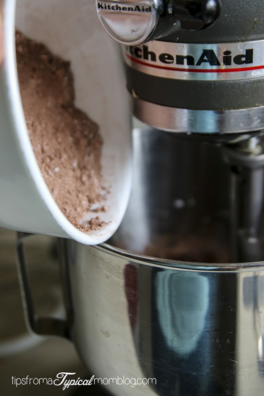 Preheat oven to 350 degrees. Lightly coat a 9×13 baking dish with non-stick cooking spray. In a large bowl, sift together flour, cocoa powder, salt, baking soda, and baking powder.