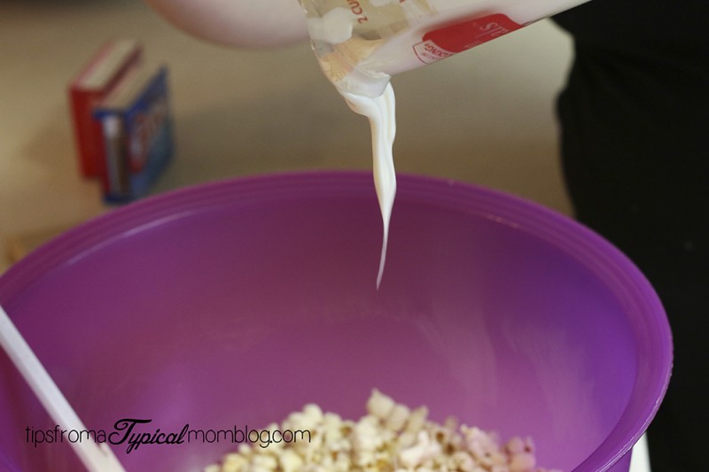 - 3. Microwave the white chocolate according to the package directions. Pour over the popcorn in the large bowl and stir to evenly coat the popcorn.