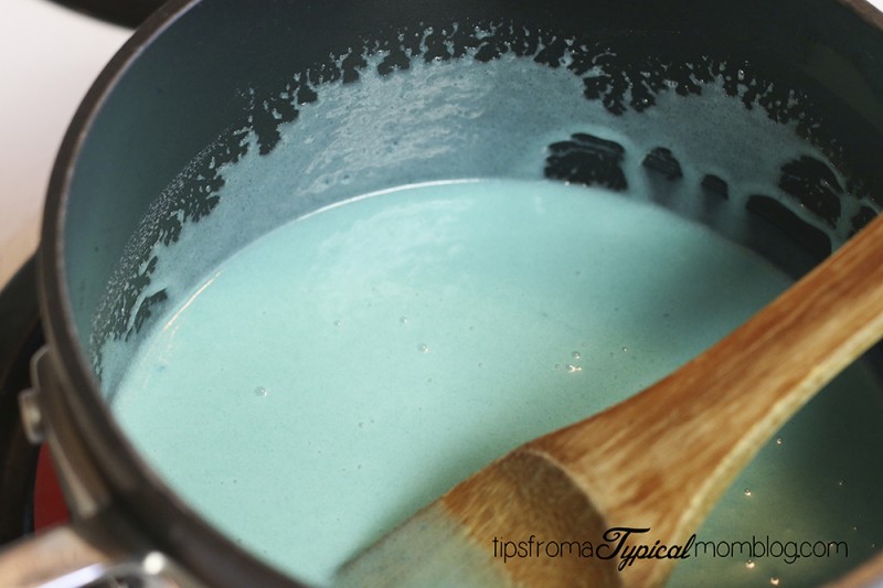 6. Pour ONE CAN of the sweetened condensed milk into a non-stick sauce pan. Pour the whole contents of one of the Jell-O flavors into the milk and stir well. Turn the heat to medium and stir constantly until the mixture resembles greek yogurt. It should not boil, but thicken.