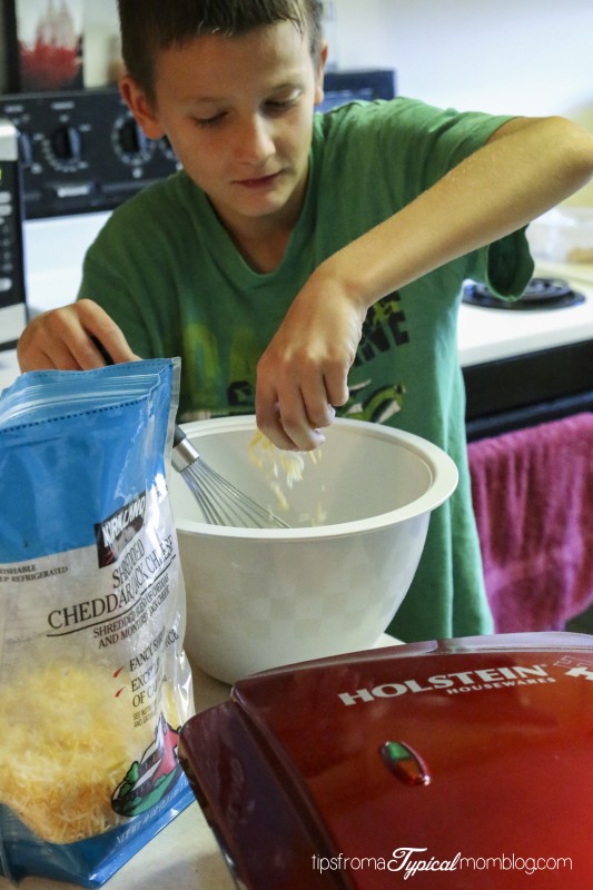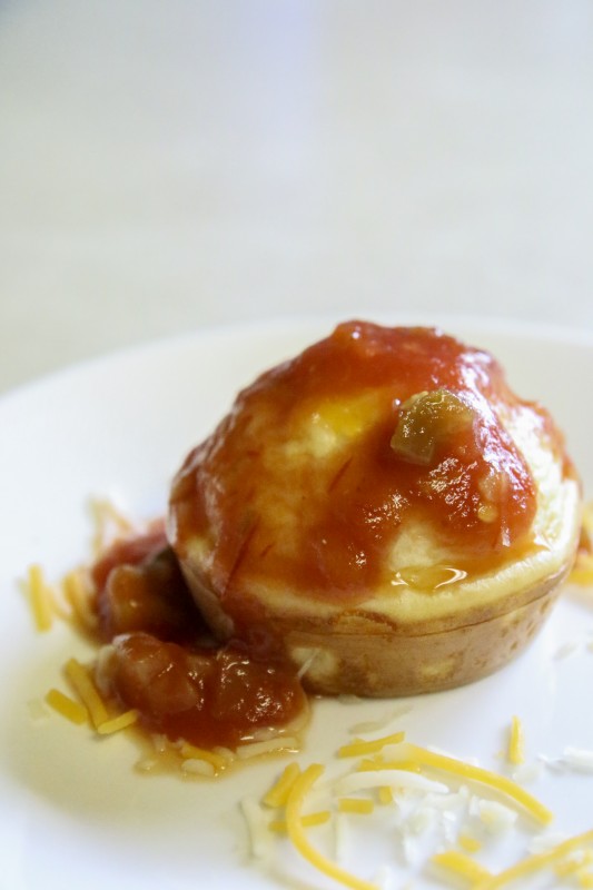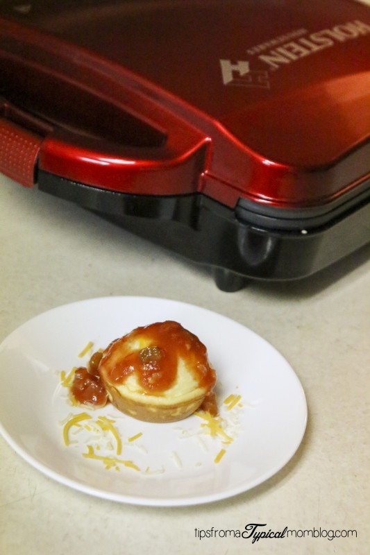 This recipe whips up in seconds and cooks in about 5 minutes in the Holstein Housewares Cupcake Maker. My 10 year old son loves making these Egg and Cheese Breakfast Muffins. They are hard to mess up. They are also very versatile too because you can add any kind of toppings you would add to an Omelette. We just added cheese this time then served them with salsa. Yum!