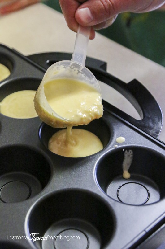 Once the cupcake maker is heated up and the light is green, pour 1/4 cup of the mixture into each cupcake hole. I didn’t spray mine with cooking spray but you can if you think it will stick. If you are adding other optional ingredients, add them to each muffin separately before closing the cupcake maker.