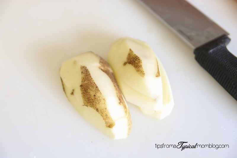 Roughly peel your potatoes. Leaving a few peelings make the potatoes more rustic. Slice the potatoes the long way about 4 or 5 times.