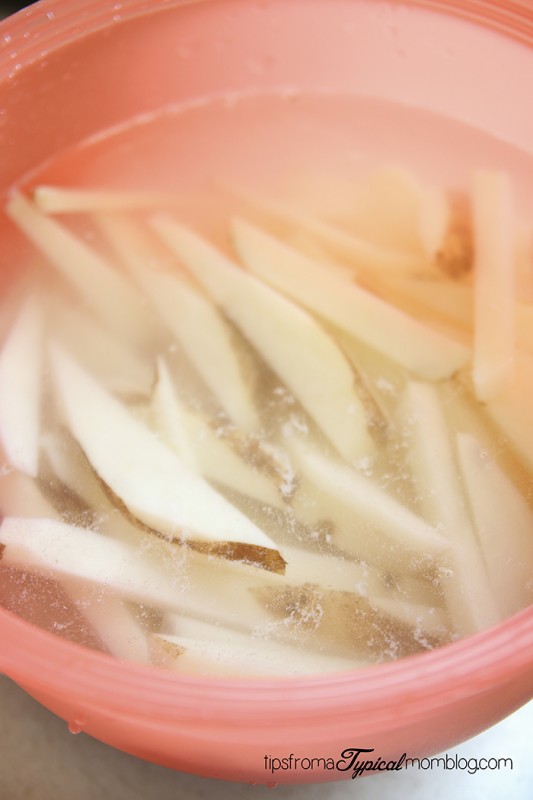 - Soak potatoes in a large bowl of water for about 30 minutes. Drain the potatoes and pat dry thoroughly with paper towels.