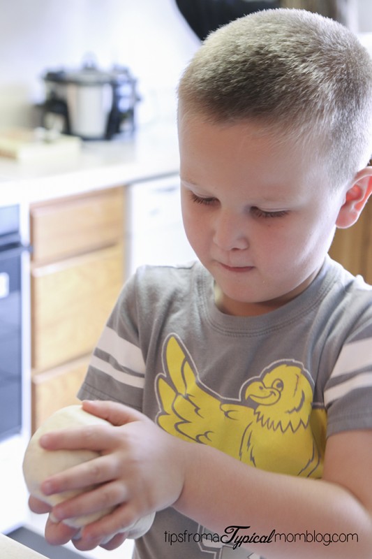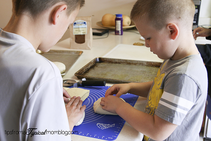 Punch dough down, and divide into 8 equal portions. Shape each portion into a 4 inch round loaf. This is when the kids really like to pitch in.