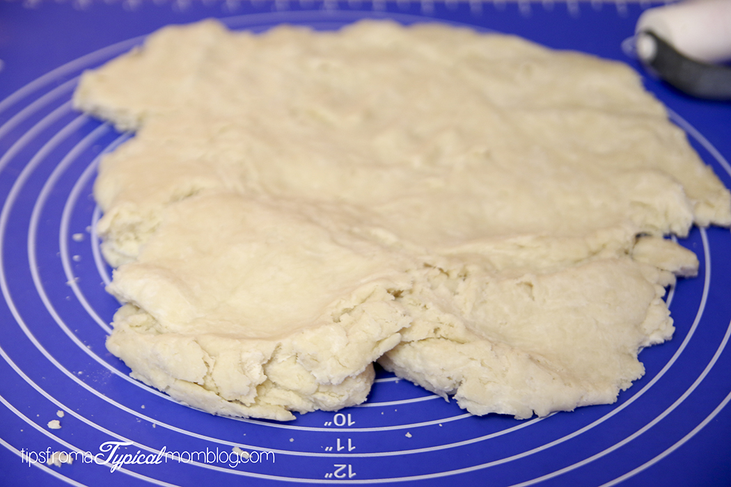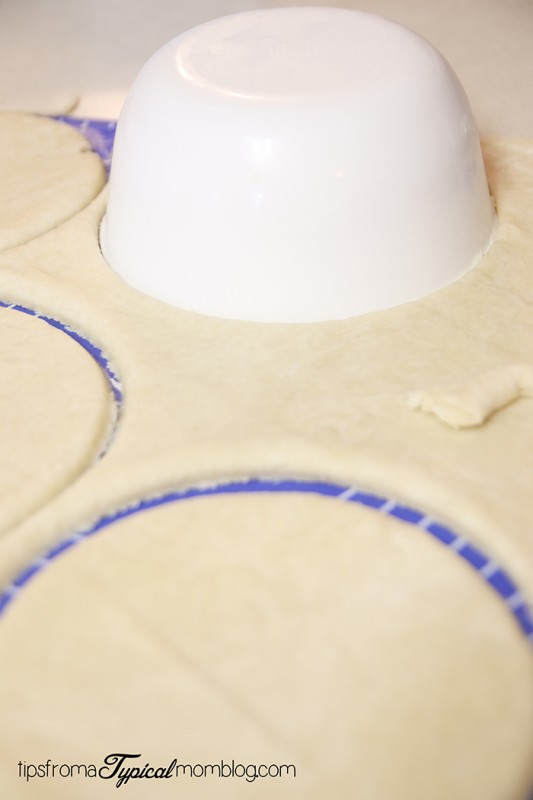 Roll out the dough to 1/8 inch thick. I love using my Pampered Chef Baker’s Roller for this. Using an upside down cereal bowl, cut circles out of the dough.