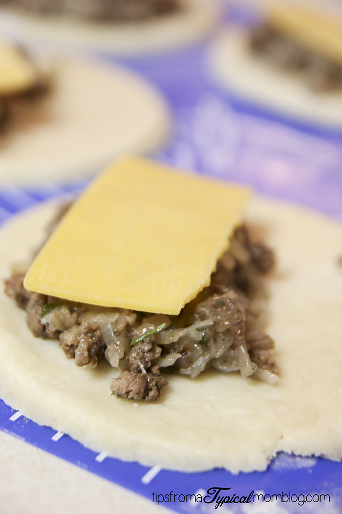 Crumble in the ground beef and add onion, parsley, allspice, dill, nutmeg and grated potatoes. Cook and stir until the meat is browned. Drain any excess grease. Turn off the heat and stir in the cheese until melted. Or keep the slices of cheese out and used to set on top of the pies. Set aside to cool.