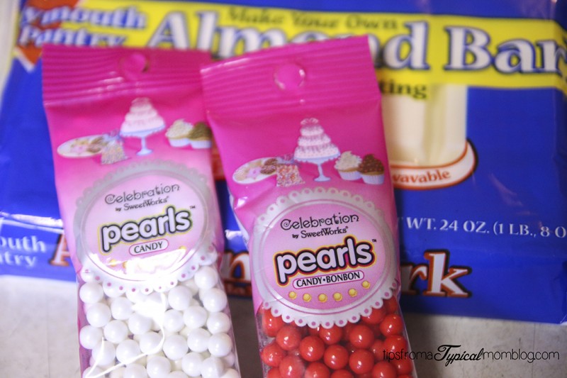 I headed to Walmart and bought these Candy BonBon Pearls. I decided not to use the white pearls because the popcorn was white, but you could use your school colors. They sell these cute pearls in all different colors down the cake decorating isle. Or you can purchase them on Amazon (affiliate link). Then all I used for the vanilla, was Almond Bark (affiliate link).