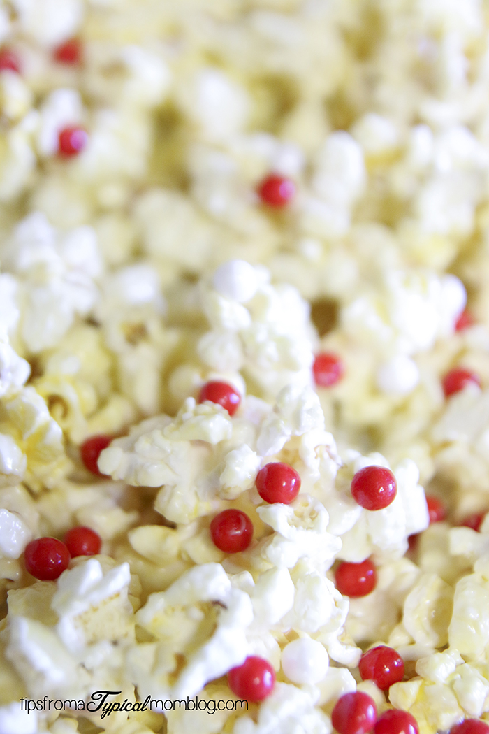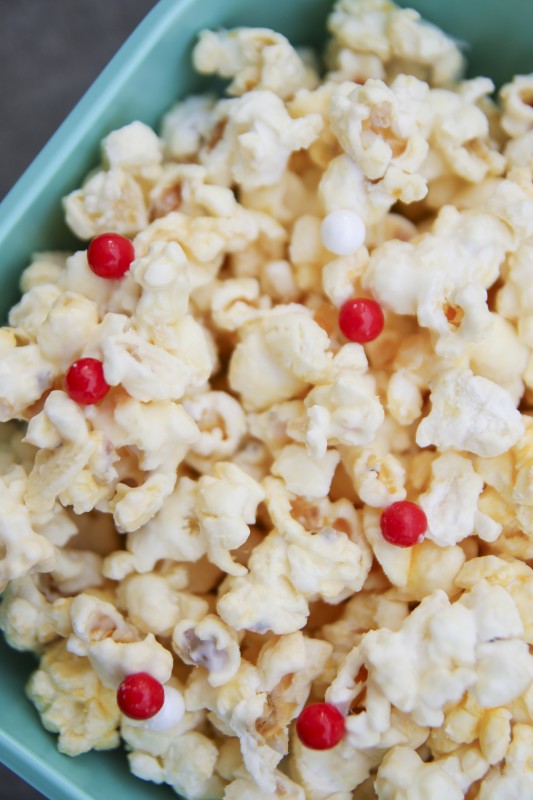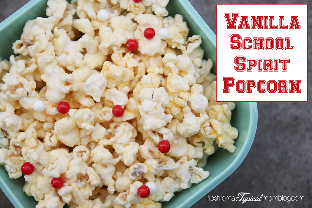 I wanted to make something fun with the school colors which are red and white, so I came up with this really easy Vanilla Popcorn recipe. You’ll die when you see how easy it is to make.