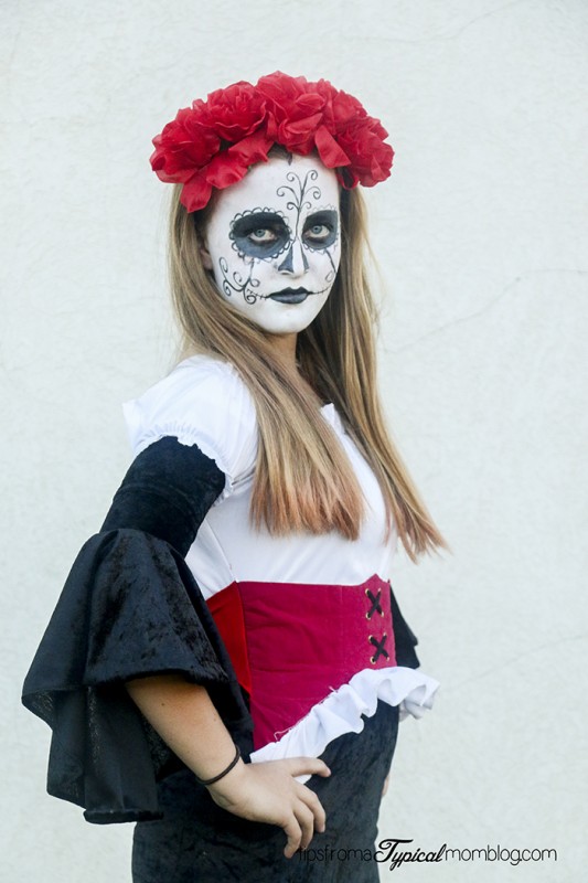 One of my daughters saw the red flowers headband from the “Spirit Halloween Mystery Box” that they sent me and she thought it would be fun to dress as a “Day of the Dead” skeleton. So we had fun painting her face. And this is what we learned as we went along.