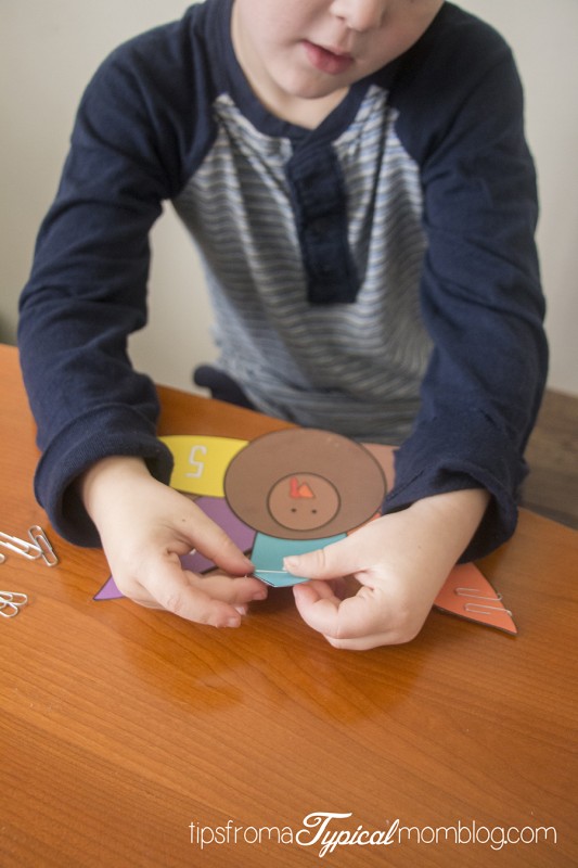 My 4 year old had a little bit of a hard time with the paper clips, so I think next time I’ll choose the clothes pins until he develops better fine motor skills to use the paper clips. But he still had a lot of fun counting and clipping.