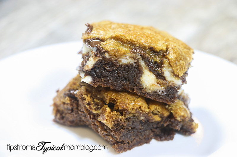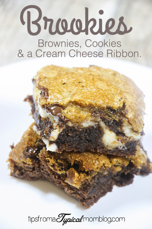 Brookies are one of my favorite desserts to make because you get two delicious treats in one. Brownies and Chocolate Chip Cookies. These are even better than Brookies because they have a ribbon of Cream Cheese in the middle. You guys. These are to die for!