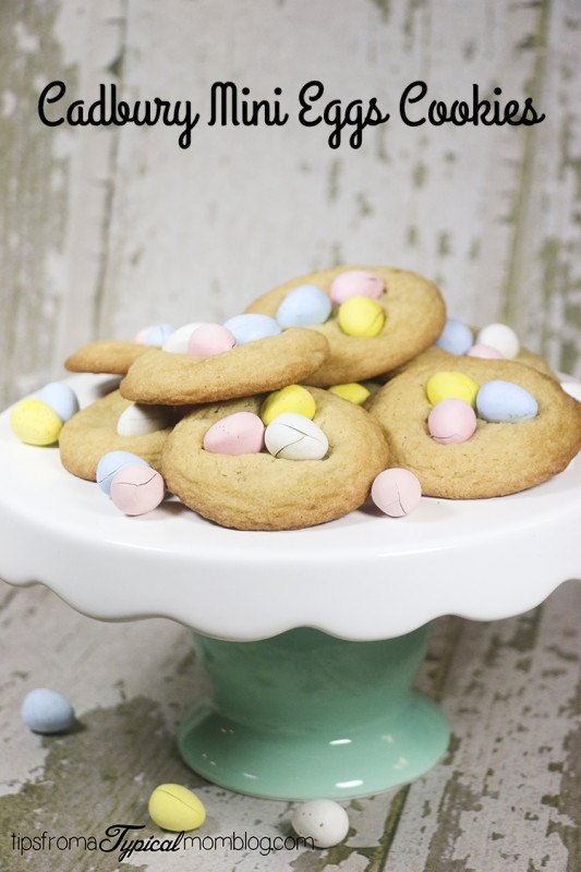 - Scoop the cookies by the 2 tablespoon size about an inch and a half apart on a baking sheet and bake at 375 degrees for 7-10 minutes or until the middle is set and the edges are a golden brown. Immediately after you pull the cookies out of the oven, press the desired amount of Cadbury Eggs into the hot cookie. I chose to do 3 different colors on each cookie. Let cool for about 3 minutes on baking sheet then remove to a cooling rack to continue to cool. Store in an airtight container for up to 2 weeks.