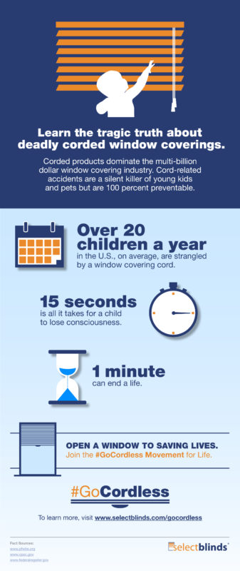On March 31, 2016, Select Blinds became the first custom window covering provider to go 100 percent cordless. They are encouraging families to join the #GoCordless Movement to help prevent needless deaths and injuries of young children and pets from window covering cord strangulation.