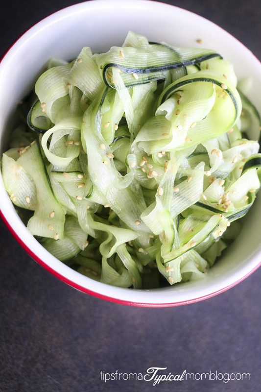 Instead of slicing the cucumber, we peeled it, seeded it and then cut it into very thin pieces using our peeler. I think this made it more fun for the kids to eat. Almost like a fettuccine noodle. It’s easy to throw together and fresh and healthy for your family. You can serve this as a side dish to just about anything you make for dinner.