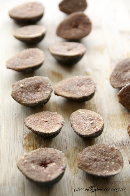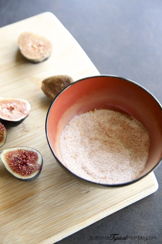 - One at a time, dip figs, cut side down, in sugar mixture to coat. Then coat figs a second time with sugar mixture and arrange cut side up on baking sheet.