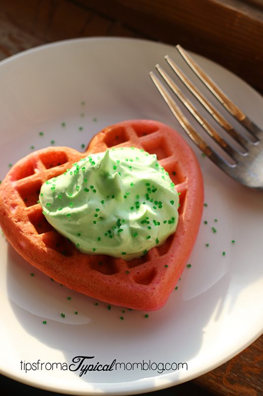 We always like to come up with something fun to make for Christmas Breakfast and these Grinch Waffles are the perfect thing! With the red heart waffle and the green whipped cream, these waffles represent the Grinch perfectly.