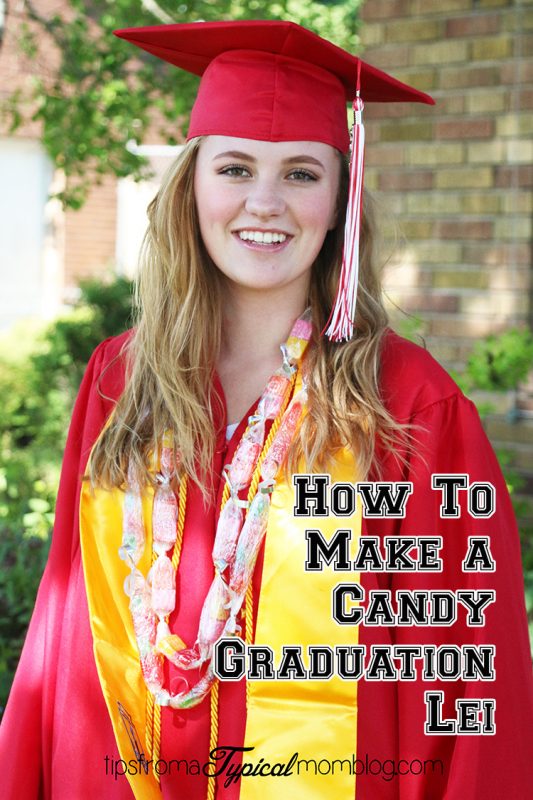 I’m sure you already know, but make sure you ask what the graduate’s favorite candy is before you head to the store. No one wants a lei made out of candy that they don’t like. We made my son’s lei’s out of Starbursts and Gummy Worms. I’ll be making more and I think I’ll make those out of snack-sized Twix and Snickers.