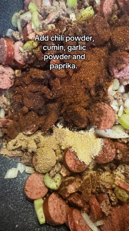 Toss in the onion and celery, and sauté for about 3-5 minutes until softened. Sprinkle in the chili powder, garlic powder, cumin, salt, and pepper. Stir well to combine.