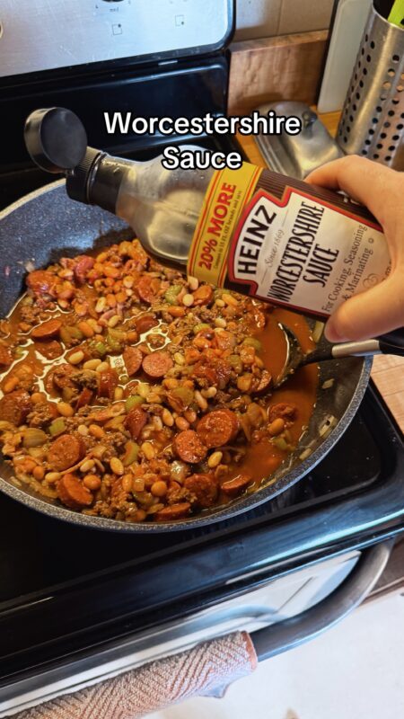 Pour in the kidney beans, pinto beans, and tomato sauce. Stir in the Worcestershire sauce, brown sugar, and water. Then—here’s the secret ingredient—add the mayonnaise. Stir everything together until it’s creamy and well combined.